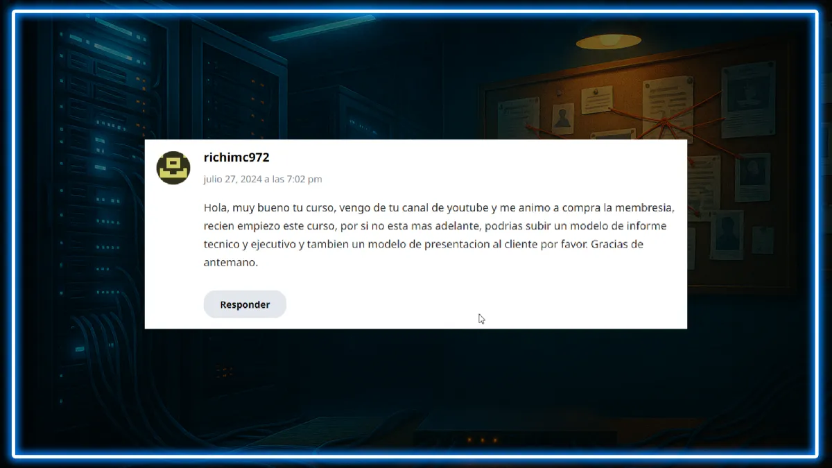 Hola, muy bueno tu curso, vengo de tu canal de YouTube y me animo a comprar la membresía. Recién empiezo este curso, por si no está más adelante, ¿podrías subir un modelo de informe técnico y ejecutivo y también un modelo de presentación al cliente por favor? Gracias de antemano.